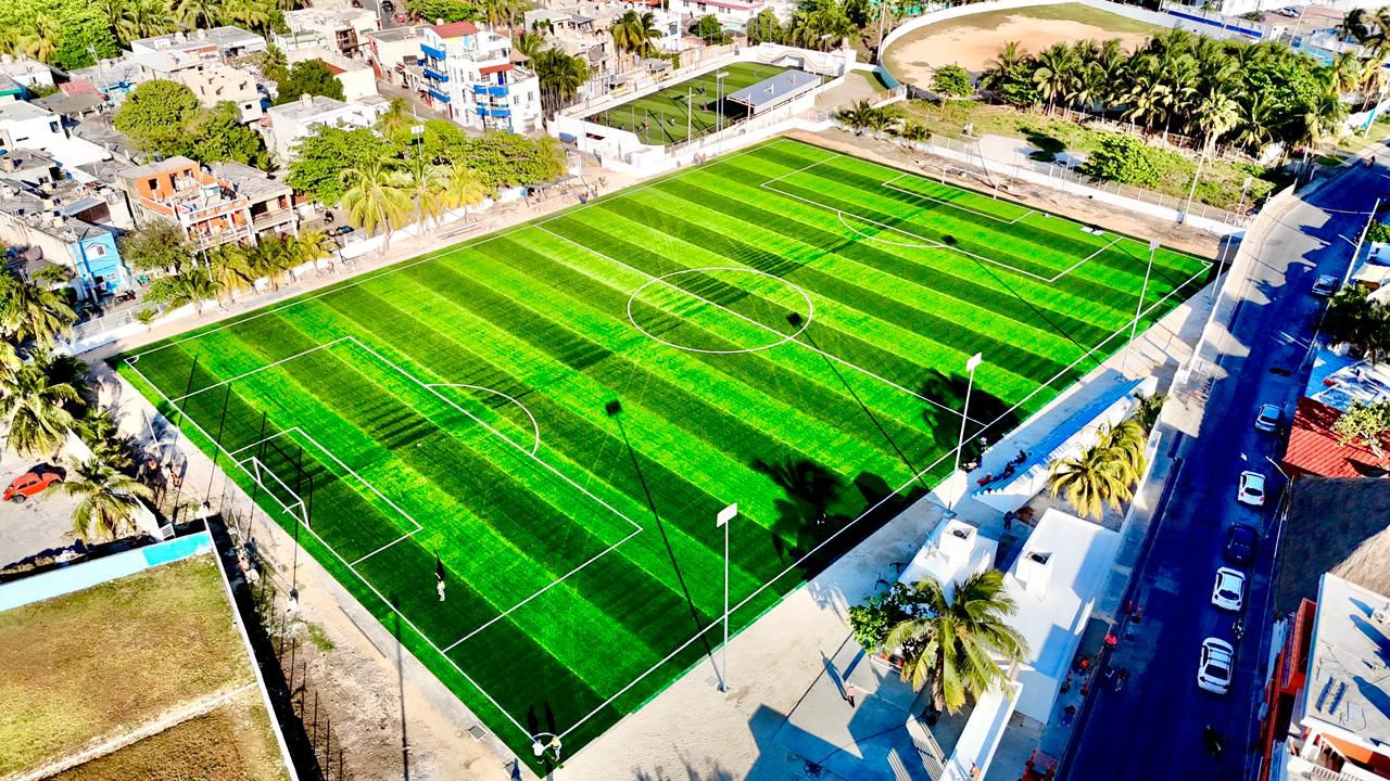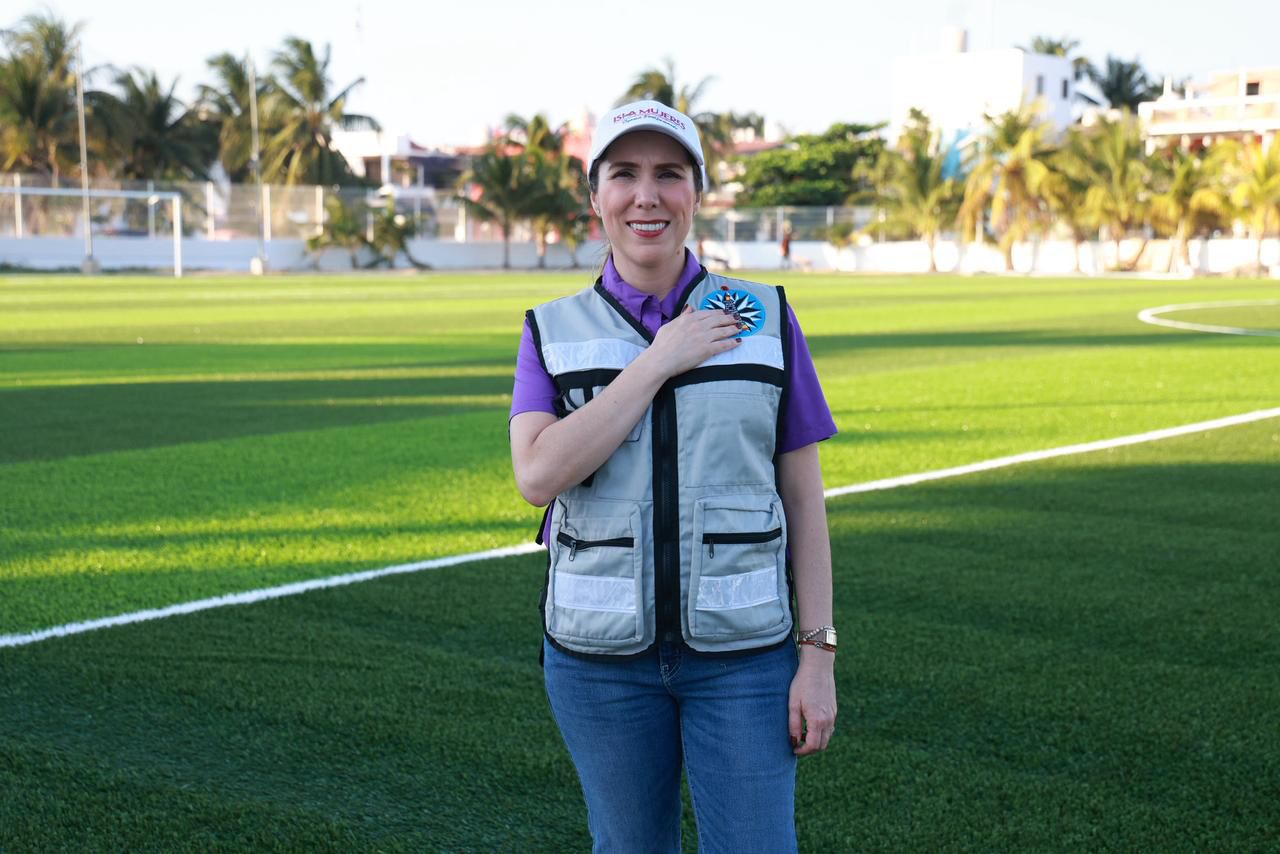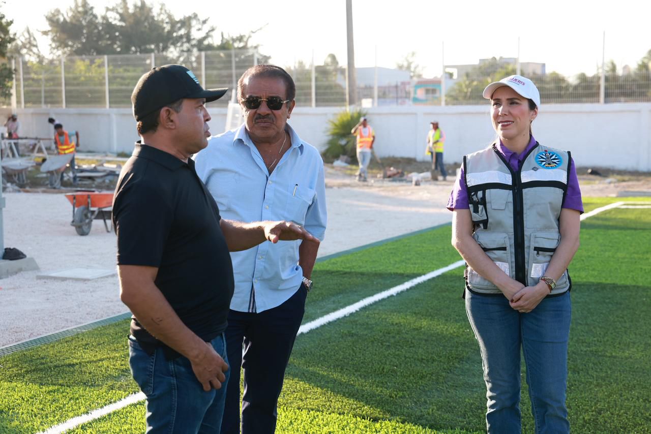 La presidenta municipal Atenea Gómez Ricalde supervisó en Isla Mujeres la modernización de la cancha de fútbol soccer, que registra un avance del 90%, como parte del fortalecimiento de infraestructura deportiva.